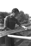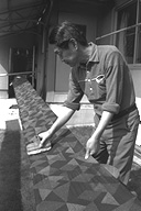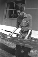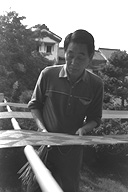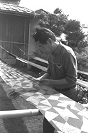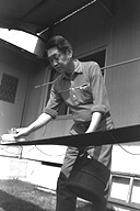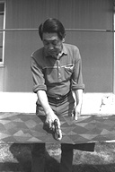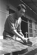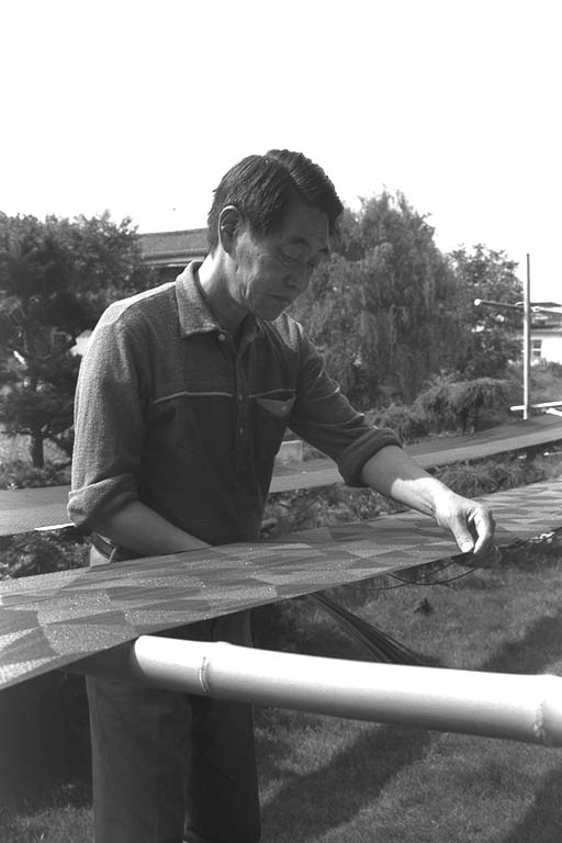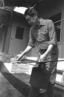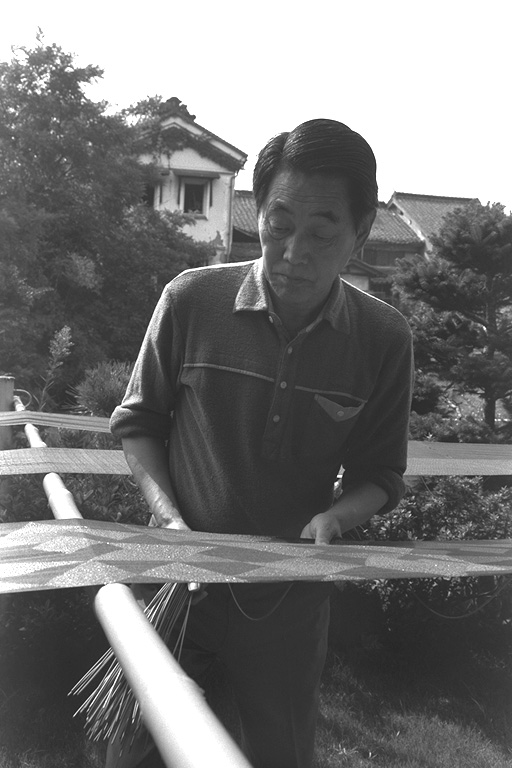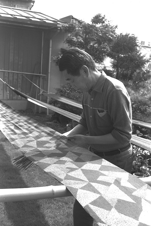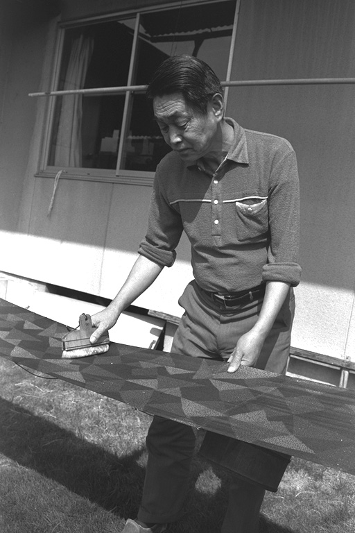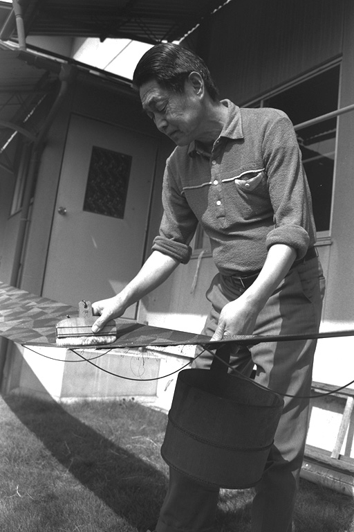 また、染物屋は立地条件にも注文が多く、川に近いこと、反物(一反は約十二メートル)を引っ張れるような広い敷地が必要なこと、作業場は南向きであることなどが要求されます。作業中、柳町さんは「なにしろ難しくて、一瞬でも気が抜けない。一生かかっても一人前にはならないかもしれんね」と、手際よい作業姿に“職人らしさ”がみなぎっていました。