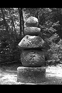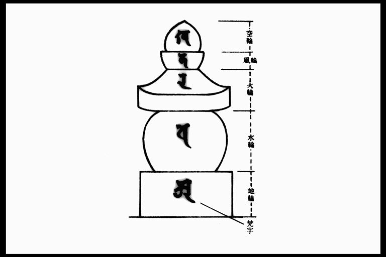 下から四角な「地輪」、円い「水輪」、屋根形の「火輪」、半円形の「風輪」、キボシ形の「空輪」を重ねてあるから五輪塔という。仏教でいう「五大」を現す。塩田平に一ばん多い石造文化財である。舞田金王五輪塔・中禅寺五輪塔などその代表的なもの。