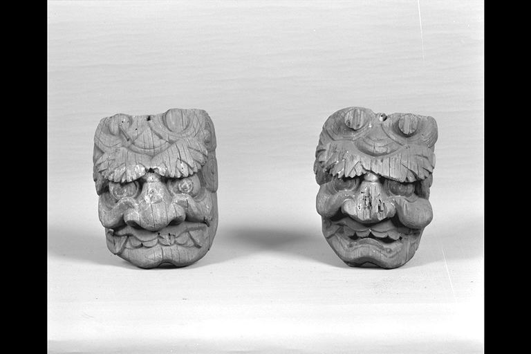 鬼面のようにも造られているが、眉間上方に釘穴と思われるものがあるので、社殿の棟にあがっていたものを取りはずして保存したものであろう。頭髪・眉・顎等の彫り方から室町時代のものと考えられている。