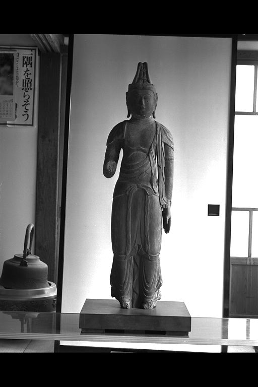 立像、高髻天冠台彫出、彫眼。左手伸下して掌を内側に五指を伸す。右手屈肘(肘よりやや先にて矧目より手先欠失)。肘釧をつけ、条帛を懸ける。裳を着け、腰紐垂下部を長く垂らす。矧付の両足先は欠失。