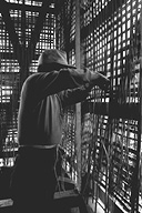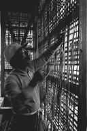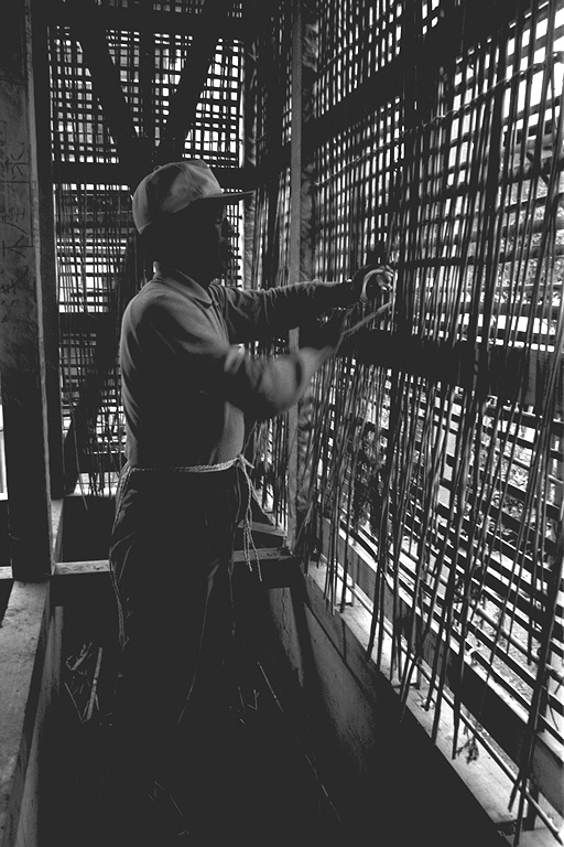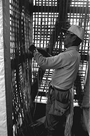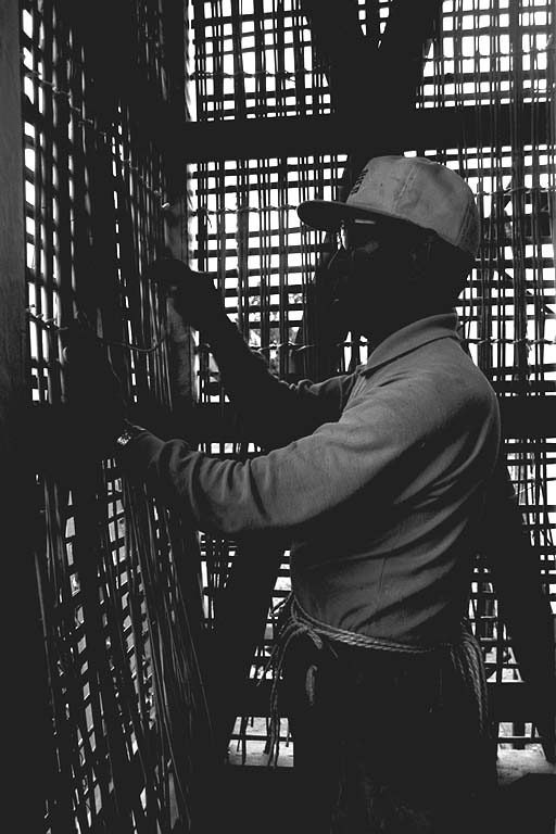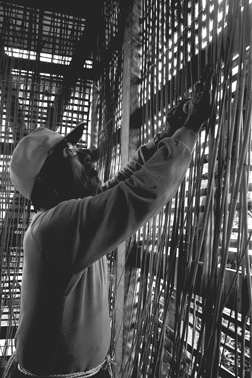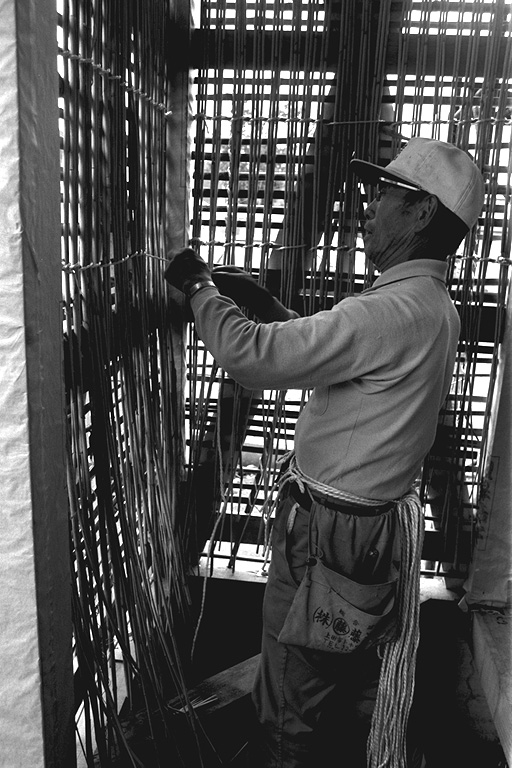 「木舞」とは、土蔵や土壁の家を造るときの、壁の下地のことです。壁を塗る前の段階で、柱と柱の間に竹などを縦横に組んで、縄で編みつけていくもの。「一般的には、横に竹、縦に葦を使って組んでいくんですよ」と金井さん。少し前までは、左官の仕事を専門にやっていて、全国を回っていました。金井さんは「左官の技術は、いろんな技術のなかでもとても難しいんですわ」と語ります。