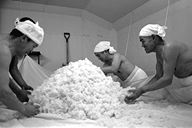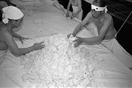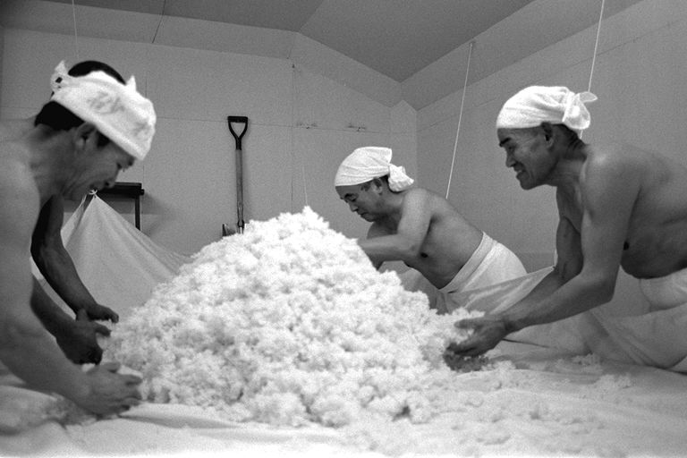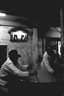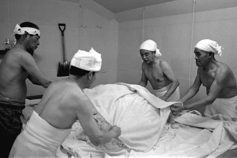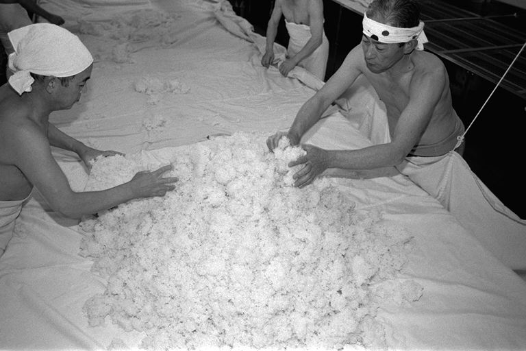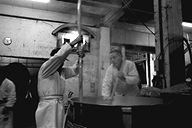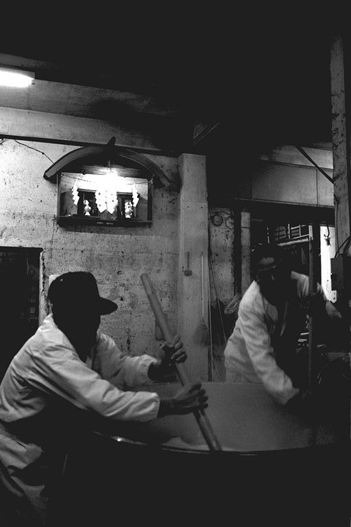 江戸(幕末)から明治にかけての民家がひっそりとたたずむ柳町界わい−。その一角、岡崎酒造では、今、酒造りが盛んです。「これから日ごとに忙しくなるねェ」と佐藤兆三さん。この秋、高橋峯男さんとともに岩手県石鳥谷町から蔵入りしています。同町は南部杜氏発祥の地。南部は越後(新潟)、丹波(兵庫・京都)と並び杜氏数が多く、今でも南部流の伝統の技法を伝えています。この日(12月6日)は、麹を造る作業。甑から蒸し上がった米をもくもくとすくい出す高橋さん。そこへ佐藤さんが手際よく種麹をまきます。麹作りは酒造りの工程の中でも、いちばん大切な仕事といわれ、細心の注意が必要です。ここには、“生きもの”を扱う緊張感が蔵全体にみなぎっていました。