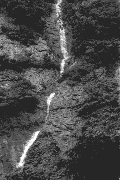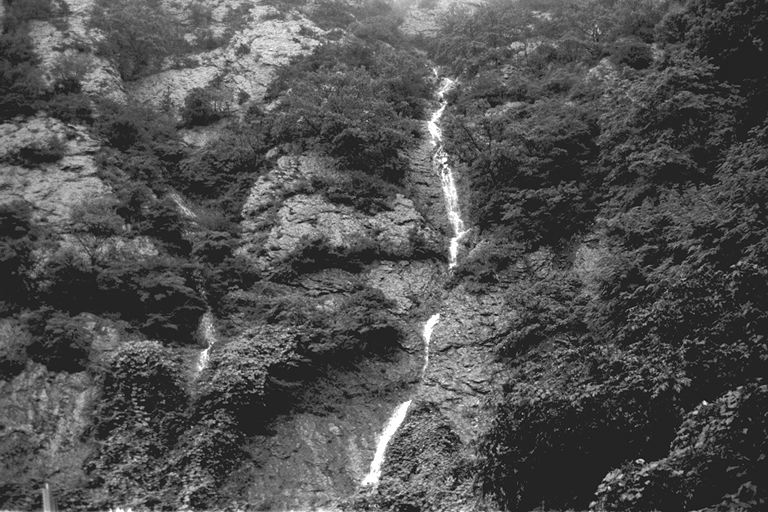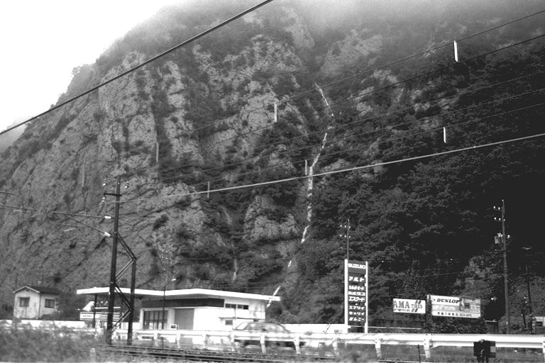 これは塩尻岩鼻の上から、大雨のときにだけ流れ出る滝です。とにかく、よほど雨が降らないと、できないんですよ。先日の長雨のときも流れていたんですが、川筋みたいで「きれいだなあ」って思いました。昔からあったものだと思うんですが、地元の人たちでも知らない人が多いんじゃないですかね。