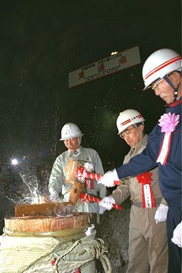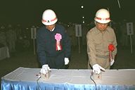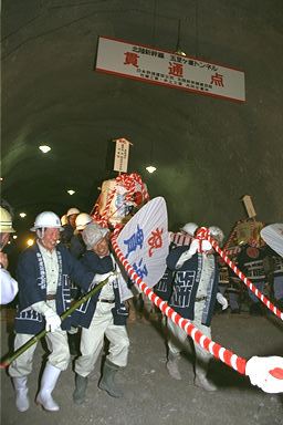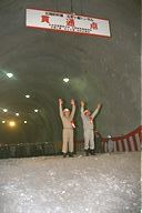 北陸新幹線五里ケ峯トンネル(上田・坂城工区7.1km)の貫通式が4月26日に行われました。上田側では、竹下市長と鉄建公団の小森北陸新幹線建設局長が発破のボタンを押して貫通。通り初めをして貫通を祝いました。 (撮影日:平成07年04月26日)