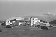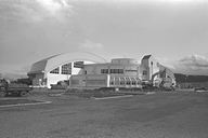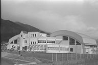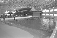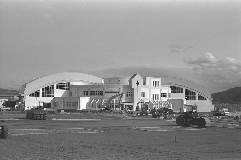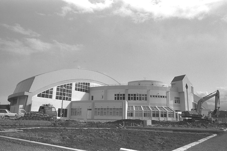 市制七十周年記念事業として、上塩尻に建設中の「アクアプラザ上田」。地上二階、地下一階で、外観は波と貝をデザインした扇形の建て物です。市民が親しめる海として、幅広く、あらゆる世代の人たちが利用でき、楽しみながら健康増進が図れる場です。また、アクアプラザの隣に、親水公園も建設中。