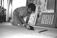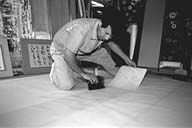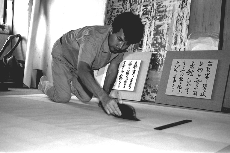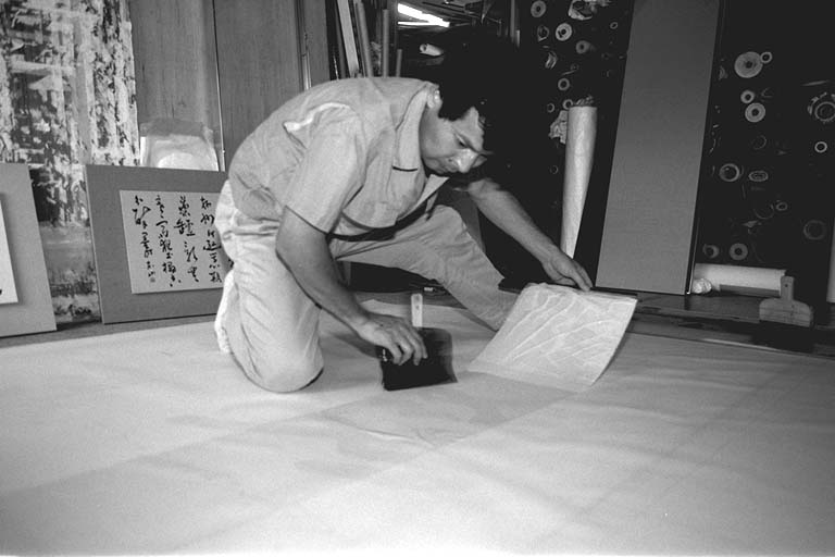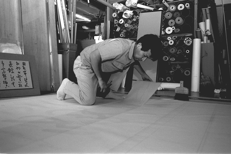ここ材木町にある表具店で工場長を務める桑原さんは、この道20余年。「預かった作品を、いかに引き立たせるかが自分たちの仕事」と語ります。作業はまず作品と、その周りを飾るきれの色を合わせること(色合わせ)から始まります。次に作品ときれを、はけでたたいたり伸ばしたりして、裏側でつなぎ合わせる作業(きれの裏打ち)を約3回。その上に和紙を3回ほど裏打ち、そして仕上げの裏打ちという過程で仕上がります。