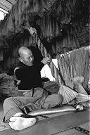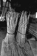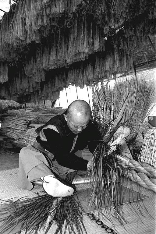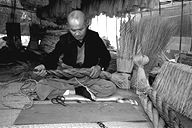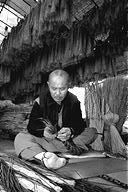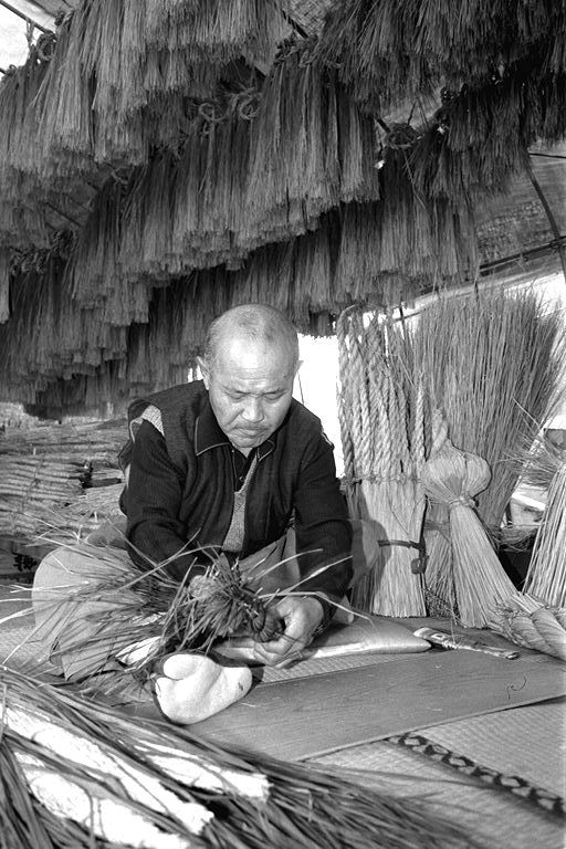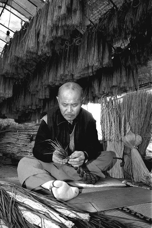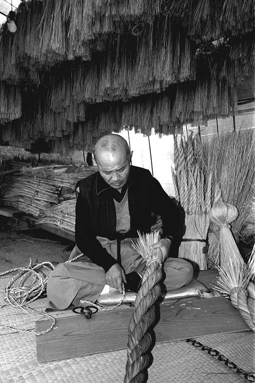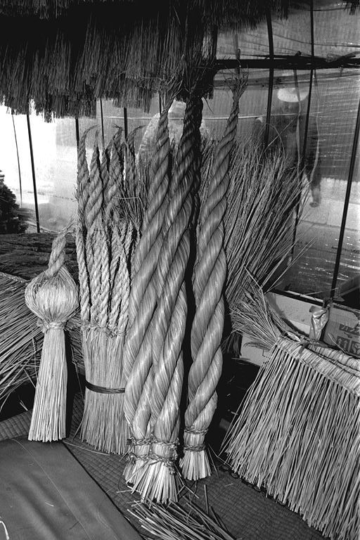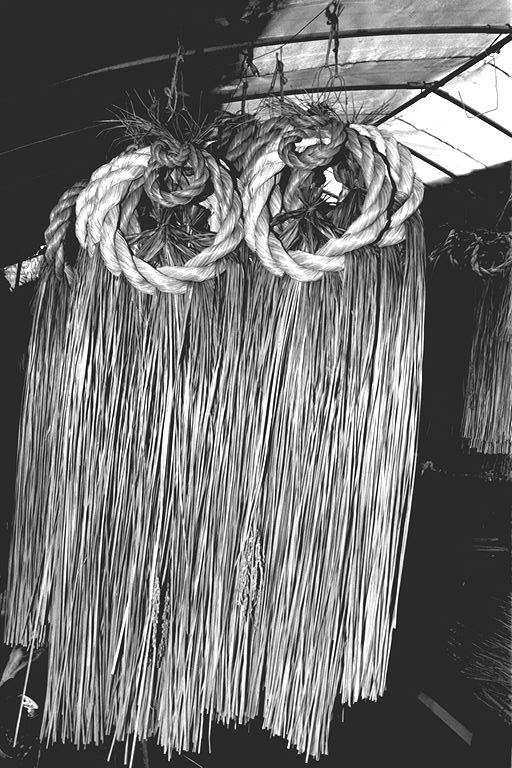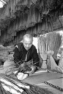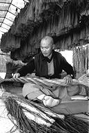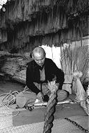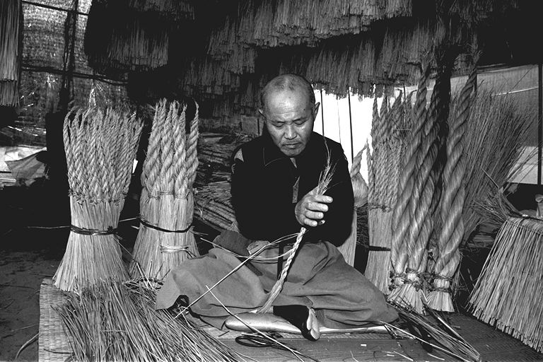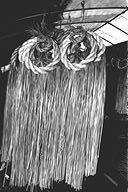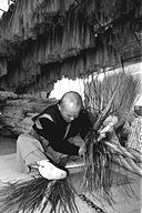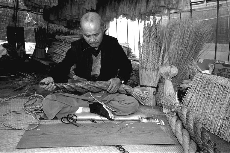 日本人は、古来より新年にしめ縄を門戸や神棚などに張って、禍神が家の中に入らないように祈念してきました。 内山さんはしめ飾りを作り続けて約三十年のベテラン。ゴボウ、ダイコン、カブ、竹の子、腕、杓子、宝子、大黒といった形にわらを丁寧に捻り上げていきます。材料は早刈りした稲(わら)と夏場湿地帯に自生するスゲ・クゴの多年草。これらを天日で乾かし、十一月から十二月にかけてしめ飾りを作ります。このあと、うらじろ、みかん、紅白の切り下げをつけて完成しますが、「上田のしめはいちばんりっぱだ。今でも上山田や松本、群馬あたりから買いに来る」と内山さん。