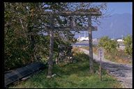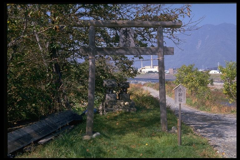 上田橋の西岸下流の川原へ降りる道の端にある水神社。天保11年と明治16年の石のほこらが並んでいる。