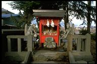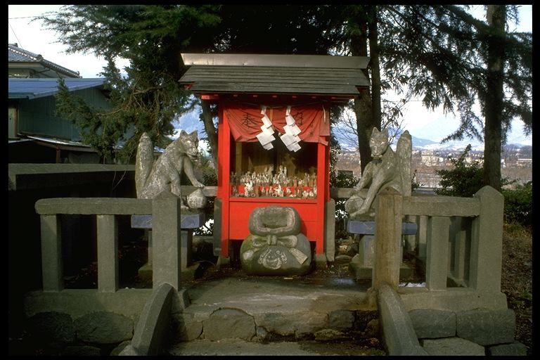 年の初めの甲子の日、初甲子にはにぎわいをみせる神社も、普段はひっそりとしている。今はほとんど見かけなくなったが、以前は、台所のかまどの上に、このお宮から配られる三本の幣束が立っていた。拝殿の裏手には小さなほこらが並んでいる。真赤に塗られたおいなりさんの前には、ちょっとおそろしげな石の狐も。木曽義仲の四天王の一人、今井四郎の墓と伝えられる塚もある。