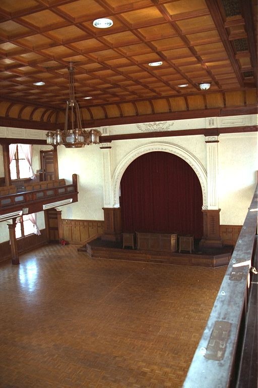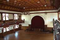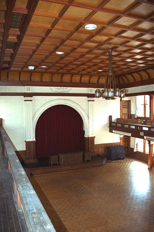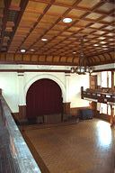 内部はりっぱな格天井に、しゃれたバルコニーが。随所に蚕の「蛾」や「繭」をデザインした彫刻が施されています。バルコニーには真鍮製の手すりがありましたが、戦争中に供出してしまったそうです。