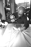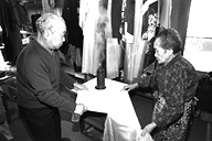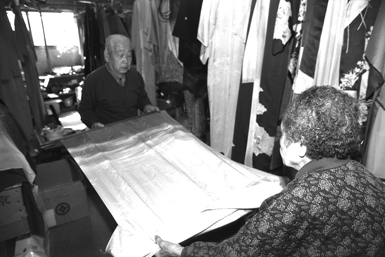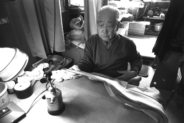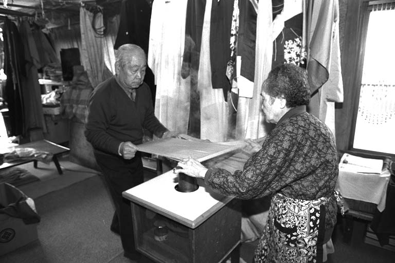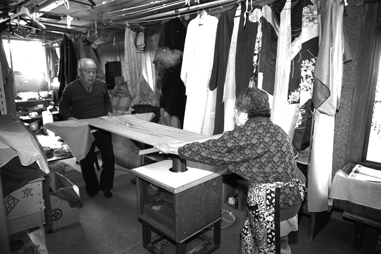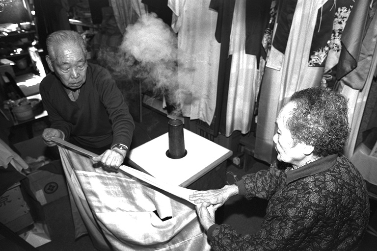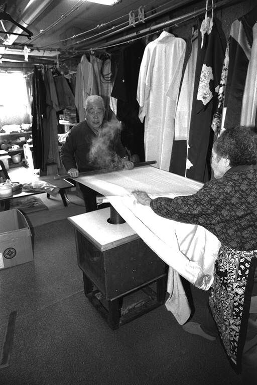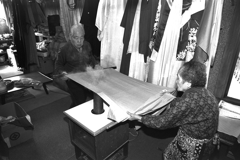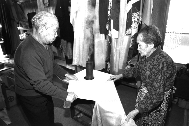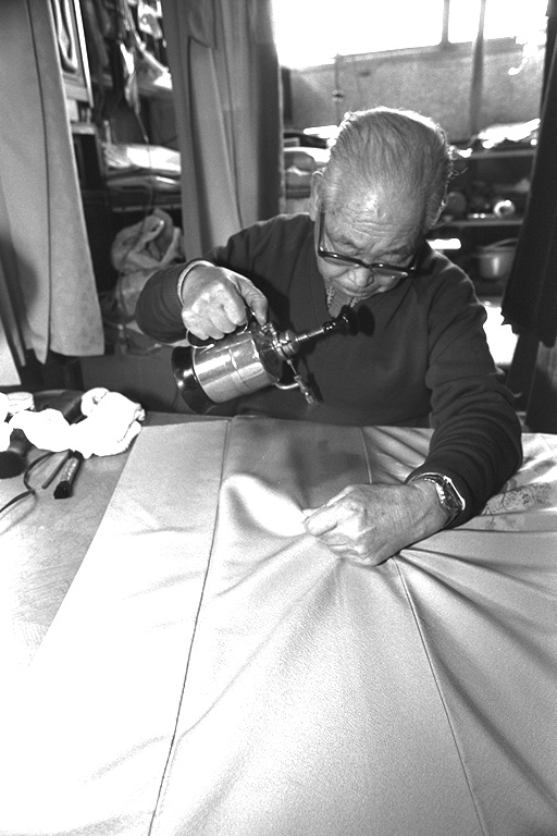 「湯伸し」とは、縮んだ表地と裏地に蒸気をあて平均にし、仕立てた状態に直す作業。一着ごと湯伸しをする「丸湯伸し」の技術は、県内では西村さんだけだそうです。「生地の特性を生かしながら、蒸気で幅も丈も伸ばしてやる」のがコツで、妻の許女さんとの息もピッタリ。