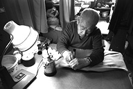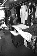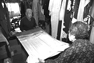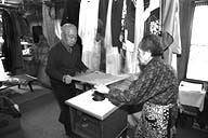 ここは、第一中学校前の阪田屋−。「特殊な仕事になっちゃって…。あれこれ、始めて、64年ぐらいかね」と、湯伸し釜に火を入れながら話す西村さん。着物の洗張、丸洗、しみ抜き、湯伸しを専門に、娘さん夫妻らと共に店を切り盛りしています。