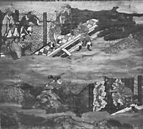 大蓮院の所用という枕屏風を、掛軸に表装し直したもの。勇壮を好んだという大蓮院らしい図柄である。伝狩野永徳筆。