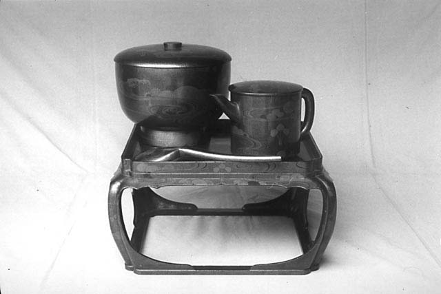膳部、飯櫃等いずれも梨地に立葵・菊・流水文様を配した見事な品々である。