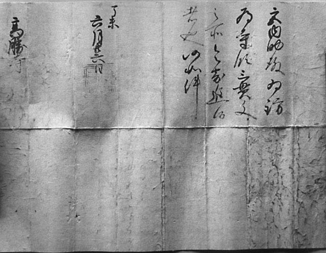 ひ(弔ひ)の為、寺領として三貫文の所、寄進せしめ候者也。仍って件の如し。